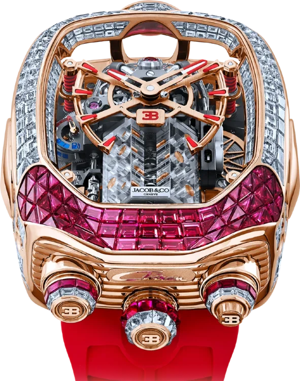 Supplement Limited Edition 1 pc. 419 baguette-cut yellow sapphires totaling 22.82 carats. Tourbillon. Skeleton. Caliber JCAM37. Power reserve up to 60 hours. Dial with blue trim. Sapphire crystal case back. The clasp is decorated with baguette sapphires. When you press the button, the watch mechanism begins to imitate the operation of a car engine.